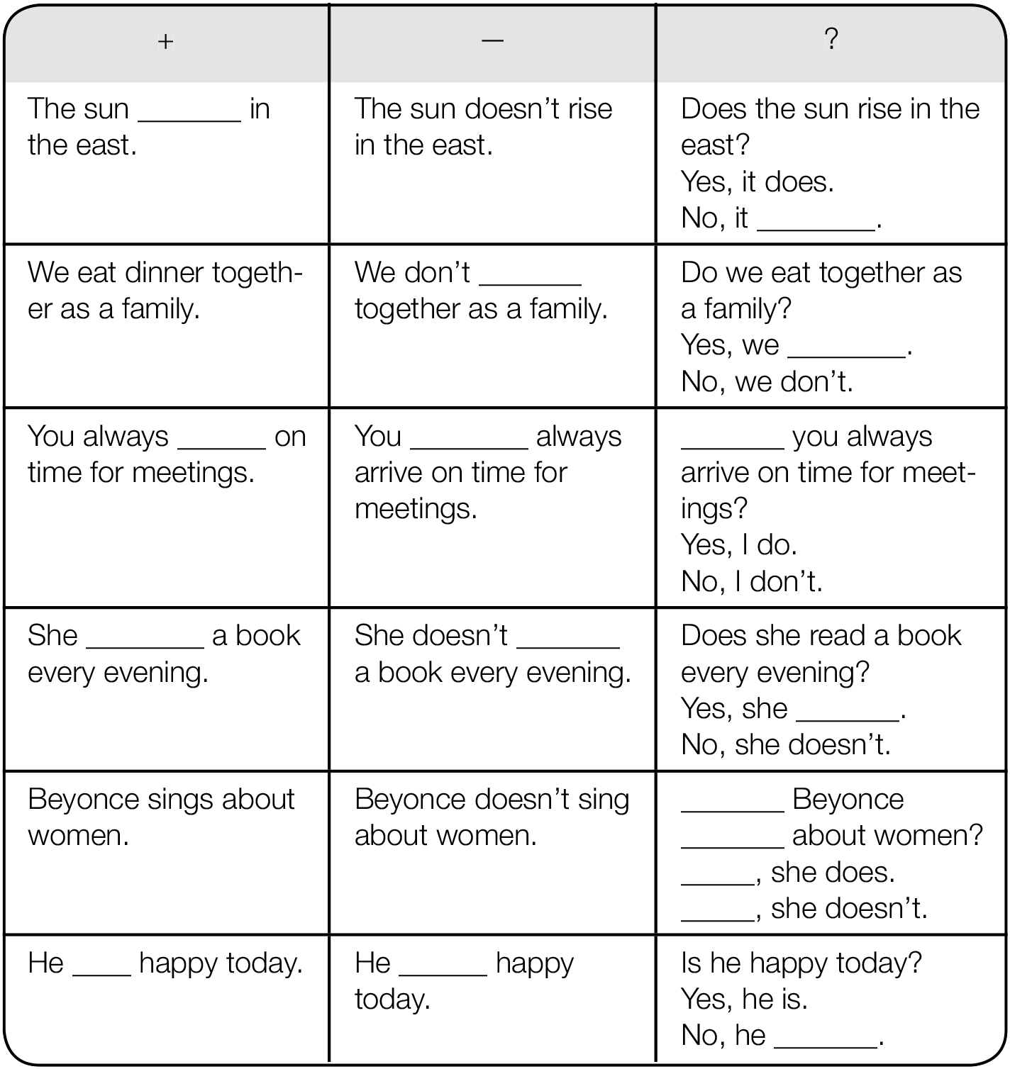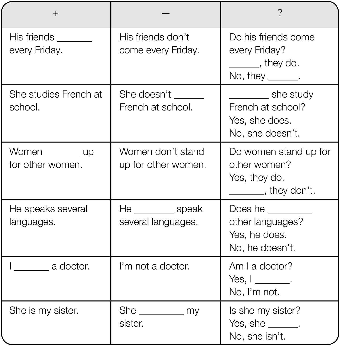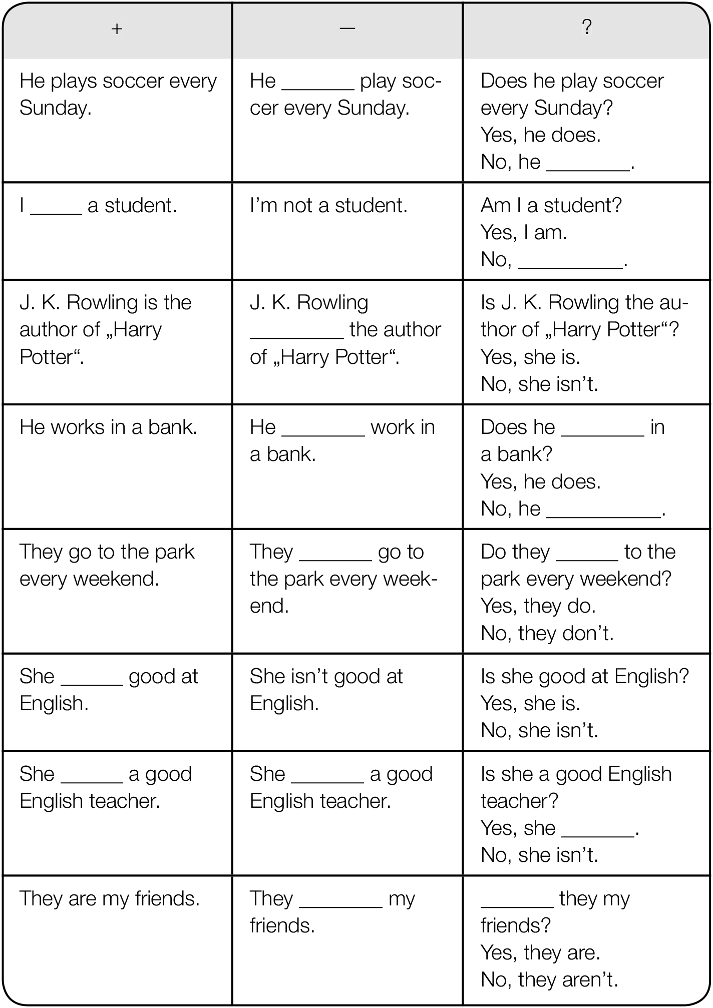 Теперь добавляем перевод предложений: если в нем действие, выбираем правильный глагол действия. Помним про окончания к глаголам действия после he / she / it: