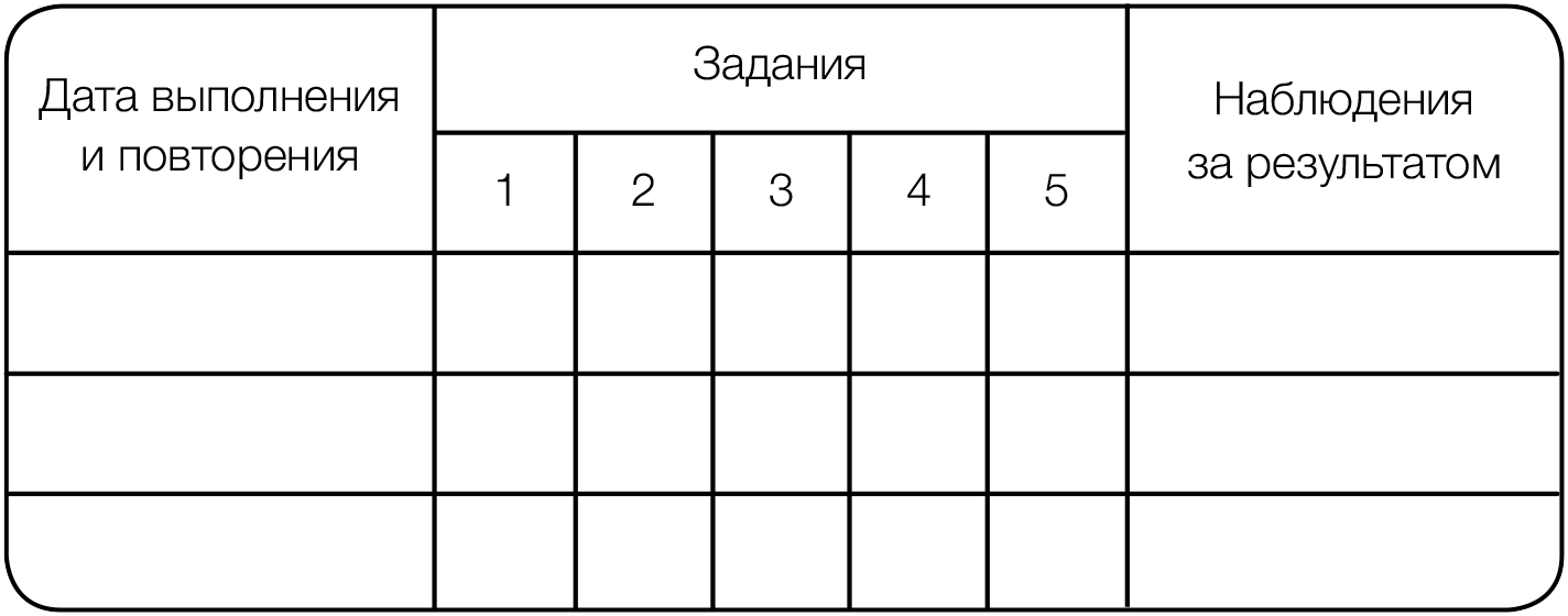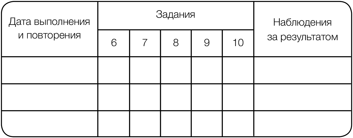 В конце каждого урока размещены трекеры, с помощью которых вы сможете вести наблюдения за успехами. Первая колонка – для записи даты выполнения и повторений задания, вторая – для отметки о выполнении конкретного задания, третья – для ваших наблюдений за результатом, будь то заметка или смайлик.