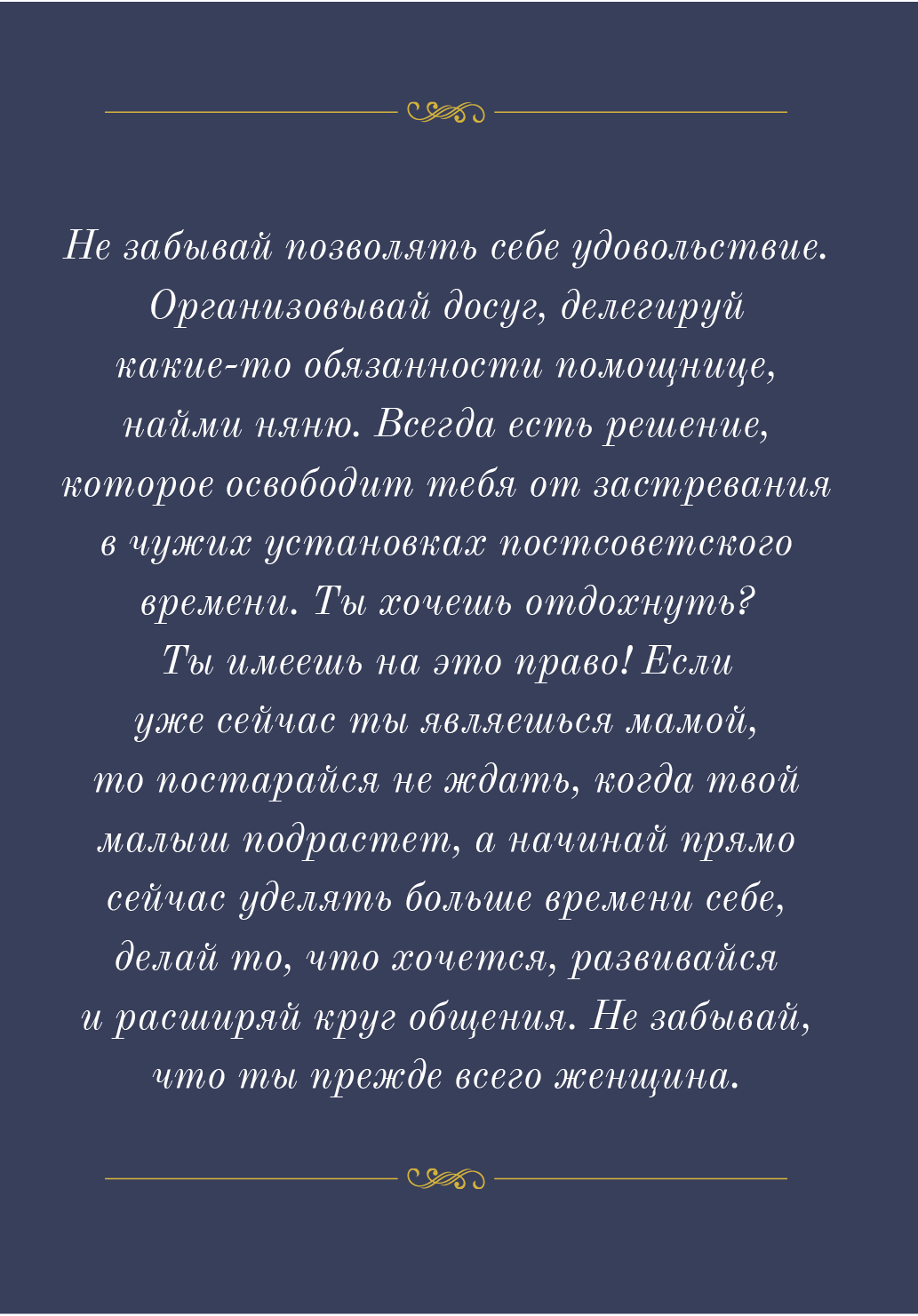 Кроме того, определенный шаблон воспитания пришел к нам из прошлого. Родители веками передавали нам послание о том, что рожать нужно рано и что бросить свою жизнь на какую-нибудь амбразуру – вообще норма. Но такой сценарий можно переписать, если посвящать время и себе тоже, работать с психологическими установками, устранять перекос в роли «Я – мать» и выводить восприятие материнства на осознанный уровень.