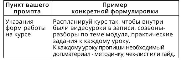 Как вы уже поняли после двух примеров, чтобы написать промпт для ИИ (= поставить задачу своему ассистенту), надо все-таки немного разбираться в процессе создания курса. Именно поэтому главу про использование ИИ в создании курса я поставила в завершающую часть книги – чтобы до того, как ускоряться с помощью технологий, вы научились правильно делать все то же самое «руками».