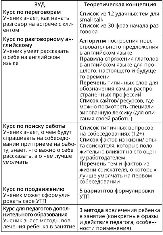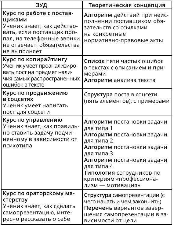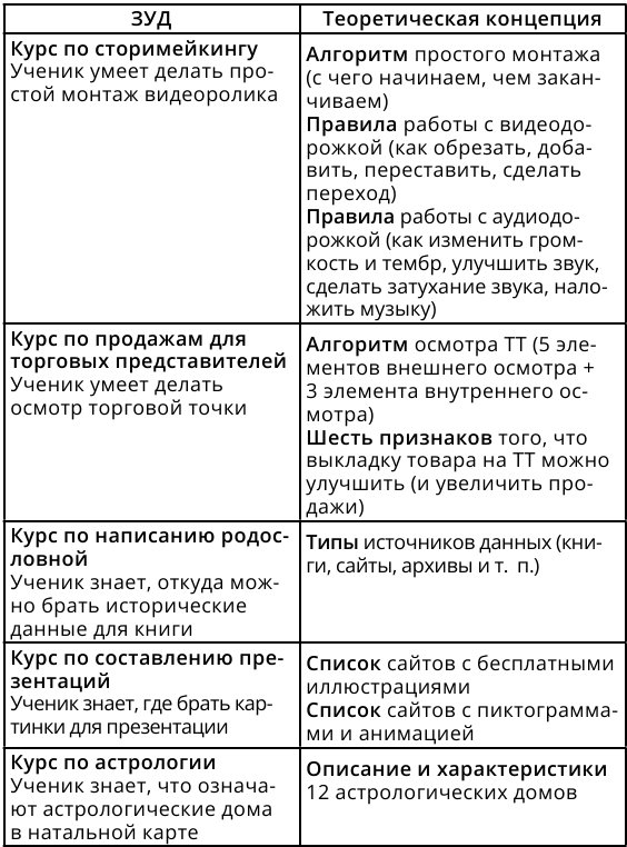 Чтобы отобрать именно тот материал, который будет нужен вашим ученикам, вам понадобятся декомпозиция курса и те ЗУДы, которые вы уже выписали, выполняя задания предыдущих глав. Теория всегда подбирается к конкретным ЗУДам.