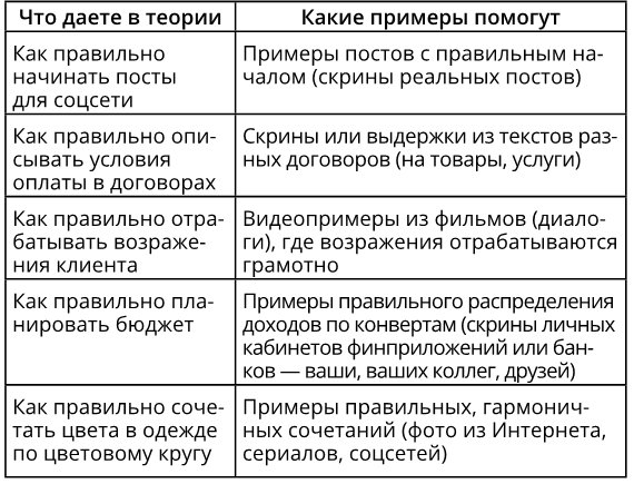 Примеры также выступают как первичные образцы действий: когда вы даете задание, то ученик может не придумывать что-то с нуля, а взять приведенный пример за образец и «докрутить» под себя.