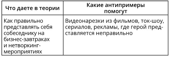 Примеры на курсе могут быть не только из серии «как можно сделать», но и «как делать не надо» – своеобразные антипримеры. Они помогают предостеречь от ошибок и неверной интерпретации теории, а в сочетании с примерами способствуют лучшему пониманию теории.
