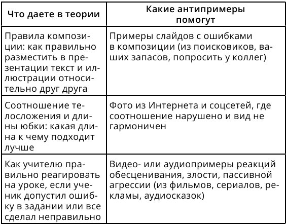 Ниже привожу схемы примеров и антипримеров для разных тем, чтобы вам было легче придумать свои. Левый столбик – тематика курса, а правый – какие примеры можно давать.