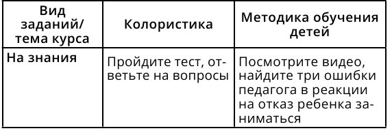 Какое конкретно задание дать, зависит от конечного результата курса, от того, к чему вы ведете учеников. В курсах, где результат ученика предполагает получение каких-то умений или трансформаций (не просто научились, а что-то сделали по-другому в своей работе/ жизни), должно быть больше практики (т. е. заданий на умения и действия). В курсах, где результат ученика – информирование, достаточно тестов. Историю про неуместное тестирование на курсе расскажу вам в главе 9, а пока просто примите к сведению, что планируемый результат курса и практические задания должны друг другу соответствовать.