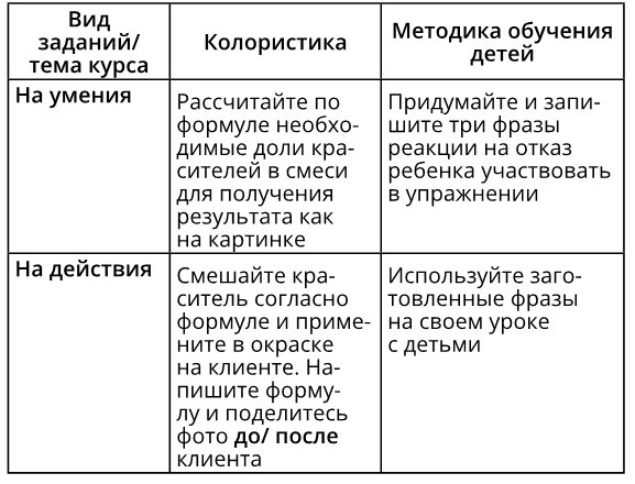 – Если на уроке мы даем какую-то теоретическую информацию (например, правила безопасности при работе с красителем) и нам важно, чтобы ученик ее запомнил, то логичным будет задание на проверку знаний.