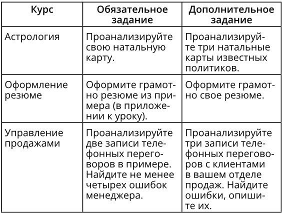 Одна моя ученица делала курс «Профессия „Менеджер по персоналу“», он был предназначен как для тех, кто фактически уже исполняет функции менеджера по персоналу в компании или совмещает эти функции с основной должностью, так и для тех, кто только присматривается к профессии и еще ни дня не проработал в этой должности. В одном из уроков она давала алгоритм анализа резюме, и в качестве задания нужно было проанализировать резюме трех соискателей на должность в компании. Задание отличное, но… выполнить его смогли бы только те, кто уже работает в компании как МПП (менеджер по персоналу). Тем, кто только учится профессии и не имеет доступа к резюме, это задание не по силам!