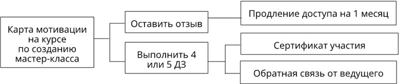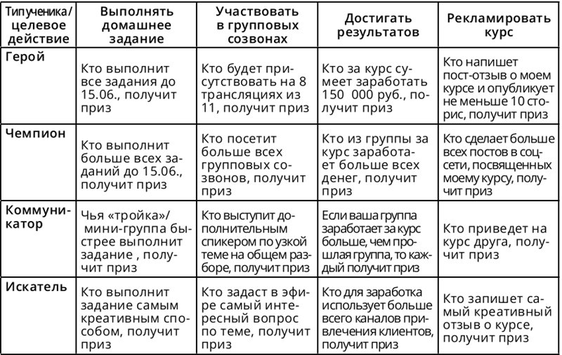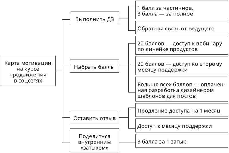 При подготовке курса составьте карту мотивации для учеников – какие действия вы хотите стимулировать, при каких условиях будете давать призы. Примеры карт мотивации курса смотрите ниже.