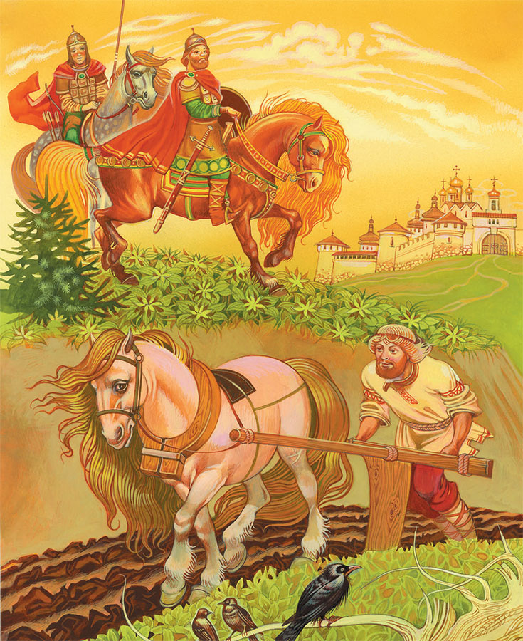 Подъехали богатыри к полю. Вытащил пахарь сошеньку, распахал широкое полюшко, засеял золотым зерном…