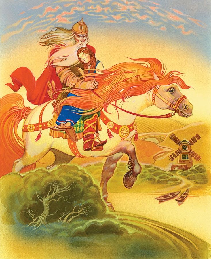 Научился он соколом по небу летать, научился серым волком обёртываться, оленем по горам скакать.