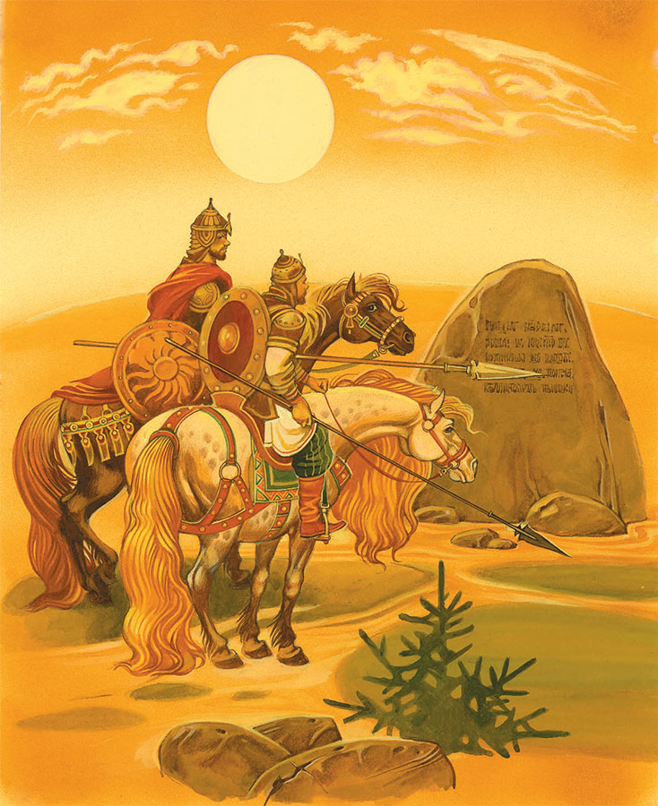 Гуляют дружинники по чистому полю, ведут богатырские игры, стрелы мечут, на конях скачут, силой богатырской меряются…