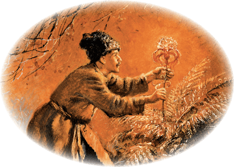 Петро хотел было спросить… глядь – и нет уже его. Подошел к трем пригоркам; где же цветы? Ничего не видать. Дикий бурьян чернел кругом и глушил все своею густотою. Но вот блеснула на небе зарница, и перед ним показалась целая гряда цветов, все чудных, все невиданных; тут же и простые листья папоротника. Поусомнился Петро и в раздумье стал перед ними, подпершись обеими руками в боки.