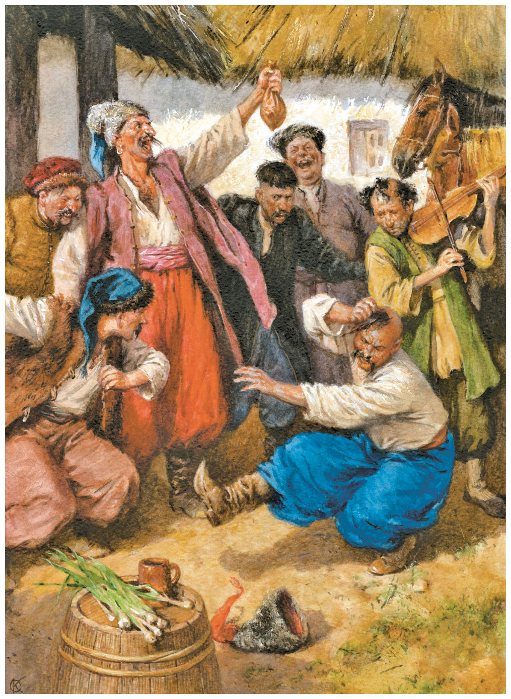 Очнувшись, снял он со стены дедовскую нагайку и уже хотел было покропить ею спину бедного Петра, как откуда ни возьмись шестилетний брат Пидоркин, Ивась, прибежал и в испуге схватил ручонками его за ноги, закричав: «Тятя, тятя! не бей Петруся!» Что прикажешь делать? у отца сердце не каменное: повесивши нагайку на стену, вывел он его потихоньку из хаты: «Если ты мне когда-нибудь покажешься в хате или хоть только под окнами, то слушай, Петро: ей-богу пропадут черные усы, да и оселедец твой, вот уже он два раза обматывается около уха, не будь я Терентий Корж, если не распрощается с твоею макушей!» Сказавши это, дал он ему легонькою рукою стусана в затылок, так что Петрусь, невзвидя земли, полетел стремглав. Вот тебе и доцеловались! Взяла кручина наших голубков; а тут и слух по селу, что к Коржу повадился ходить какой-то лях, обшитый золотом, с усами, с саблею, с шпорами, с карманами, бренчавшими как звонок от мешочка, с которым пономарь наш, Тарас, отправляется каждый день по церкви. Ну, известно, зачем ходят к отцу, когда у него водится чернобровая дочка. Вот один раз Пидорка схватила, заливаясь слезами, на руки Ивася своего: «Ивасю мой милый, Ивасю мой любый! беги к Петрусю, мое золотое дитя, как стрела из лука; расскажи ему все: любила б его карие очи, целовала бы его белое личико, да не велит судьба моя. Не один рушник вымочила горючими слезами. Тошно мне. Тяжело на сердце. И родной отец – враг мне: неволит идти за нелюбого ляха. Скажи ему, что и свадьбу готовят, только не будет музыки на нашей свадьбе: будут дьяки петь вместо кобз и сопилок. Не пойду я танцевать с женихом своим: понесут меня. Темная, темная моя будет хата: из кленового дерева, и вместо трубы крест будет стоять на крыше!»