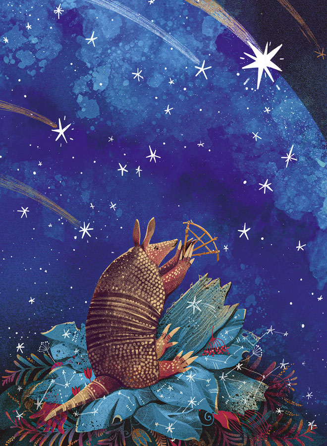 Броненосец Хотото не любил громких звуков, суеты и приключений с погонями и опасностями: ему больше нравилось сидеть себе спокойно в норе или лакомиться муравьями на палочке. Чужие приключения и истории его тоже не занимали – разве что рассказы об устройстве мира и особенно ночного неба. Но никто в лесу ничего такого не мог ему рассказать – и потому все открытия Хотото приходилось делать самому. Кто его знает, зачем маленькому броненосцу всё это огромное небо, но Хотото мог ночи напролёт разглядывать звёзды и даже придумал им собственные названия: Чуа, Котори, Юно… Он, конечно, догадывался, что у этих звёзд есть и другие имена, но понятия не имел какие.