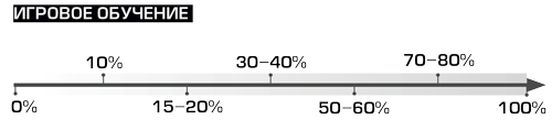 ● А использование в рамках обучения более сложных и разнообразных обучающих игр, создаваемых под конкретные цели и дающих определенный результат, в зависимости от их формата и количества даст игровое обучение насыщенностью на уровне от 70–80 % до 100 %.