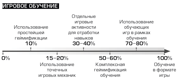Давайте для большего удобства представим некую шкалу насыщенности обучения игровыми элементами от 0 до 100 % и отметим на ней определенные точки: они будут условными, но помогут нам лучше понять характеристики того или иного формата.