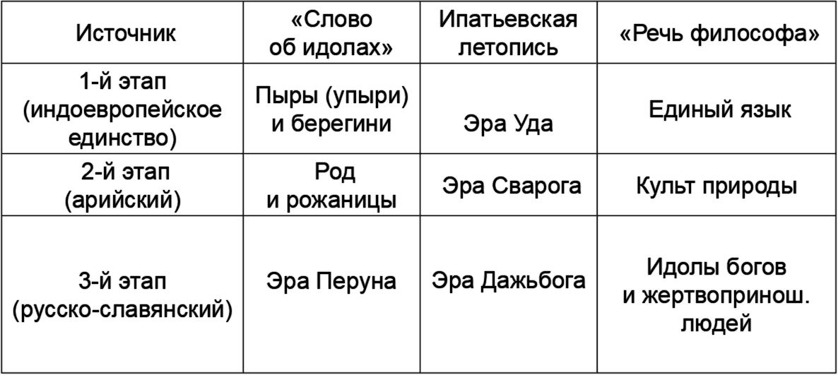 Автор «Слова об идолах» и ипатьевский летописец, будучи христианами, сохранили элементы объективности при оценке язычества. Предложенные ими схемы периодизации язычества схожи по существу. Авторы «Повести временных лет» отказались от сколько-нибудь содержательного обсуждения древнейшей религии русского народа. Ученые, ориентирующиеся на «Повесть временных лет», как на главный источник по истории Руси, не признают арийского этапа. Но автор «Слова об идолах» и ипатьевский летописец фактически утверждают его существование. И делают это весьма убедительно.