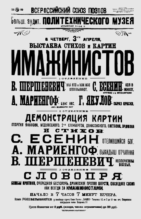 В 1919 году в Москве объединились несколько известных поэтов и объявили себя имажинистами (в своем творчестве стремились к передаче реальности через поэтические образы). У истоков этого течения стояли четыре человека: Мариенгоф, Есенин, Шершеневич и Кусиков. Имажинисты обрушивались с резкой критикой на уже существующие направления искусства Серебряного века – футуризм, символизм, пассеизм.