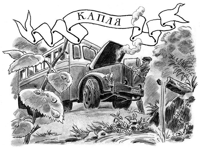 Однажды на берег пришёл человек. Он спустился к самой воде и ведром зачерпнул меня и моих соседок. Сделано это было очень бесцеремонно. Многие капли рассердились и выплеснулись из ведра. Я, верно, тоже выплеснулась бы. Но я была на самом дне и поэтому через минуту попала в радиатор грузовика. Человек был шофёром, он подъехал на автомобиле к реке, чтобы долить воды.