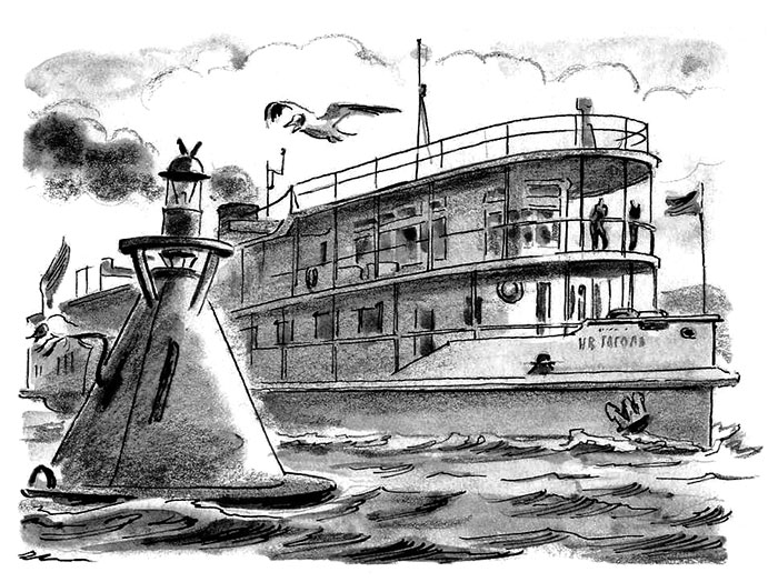 Теплоход круто повернул. Его высокий белый бок оказался совсем рядом с бакеном. Мимо лампочки проплыли круглые светлые окна, шлюпки, закрытые брезентом, мокрый флаг на корме – он трепетал и бился в порывах ветра.