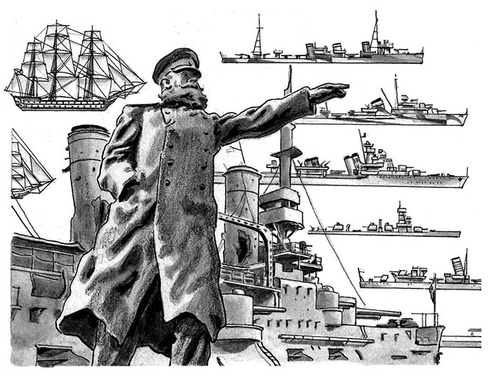 В следующей – корабли, названные именами полководцев и флотоводцев России: «Дмитрий Донской», «Князь Пожарский», «Суворов», «Кутузов», «Адмирал Ушаков», «Генерал-адмирал Апраксин», «Пётр Великий»…