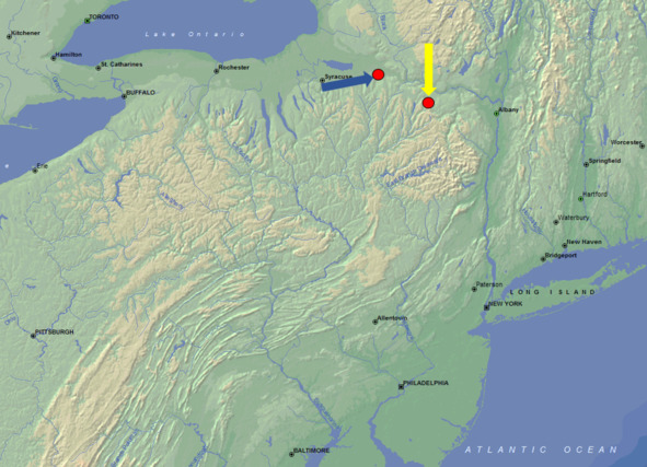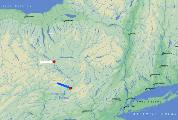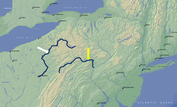 Река Аллегейни (белая стрелка), западный рукав реки Саскуэханна (желтая стрелка)