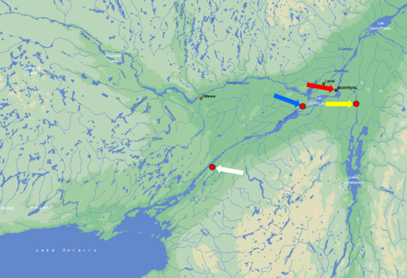 Монреаль (красная стрелка), форт Сент-Джон (желтая стрелка), Кедровый Ручей (синяя стрелка), форт Освегатчи (белая стрелка)