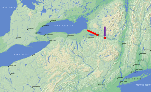 Деревня Онакуага (белая стрелка). Красной линией отмечены южная и восточная границы штата Нью-Йорк. На севере штат граничит с Канадой.