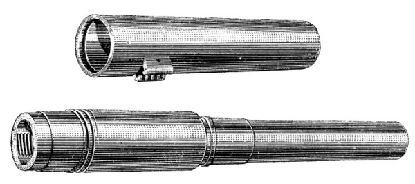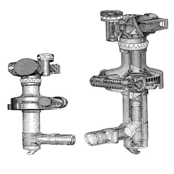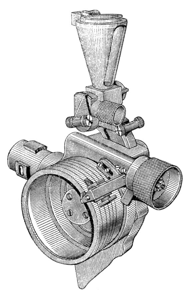 Панорама Герца, устанавливаемая в корзинку прицела, на марше снимаемая с него и перевозимая в отдельном ящике на лафете орудия. Слева – общий вид, справа – разрез устройства.