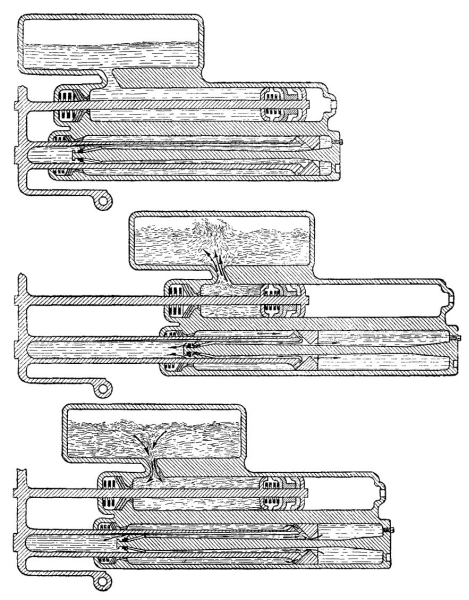 Схема расположения в салазках цилиндров тормоза отката (средний), накатника (нижний), воздушных резервуаров (верхние), соединительных отверстий и каналов между ними.