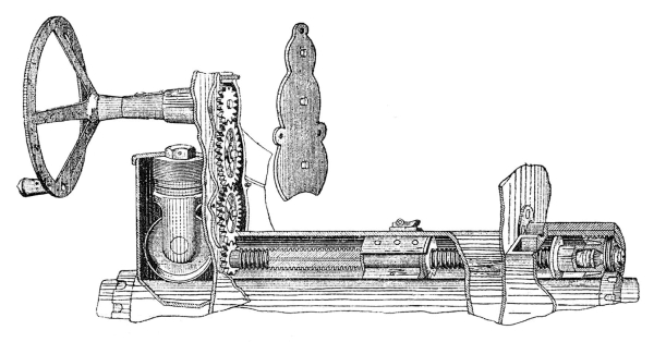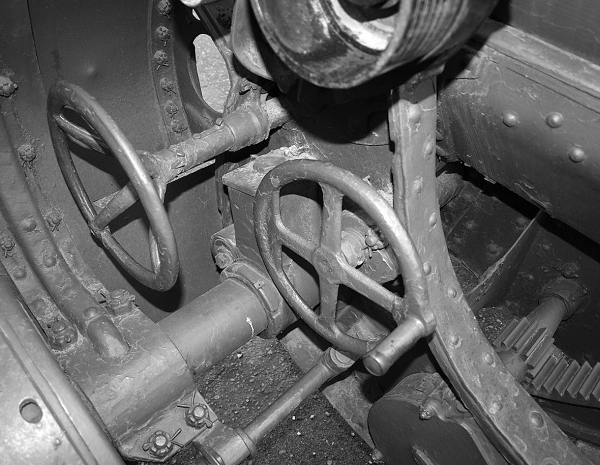 Вид на левую сторону станка с маховиками поворотного и подъёмного механизмов. Внизу хорошо видна шестерня последнего в зацеплении с зубчатым сектором люльки.