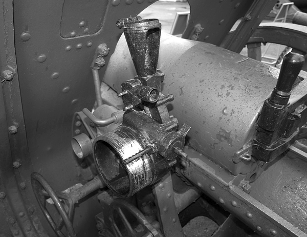 Нормализованный прицел обр. 1930 г. на 122-мм гаубице обр. 1910/30 гг. Часть деталей отсутствует: на устройстве нет бокового уровня, ручки подъёмного механизма прицела и ползунка – указателя шкал.