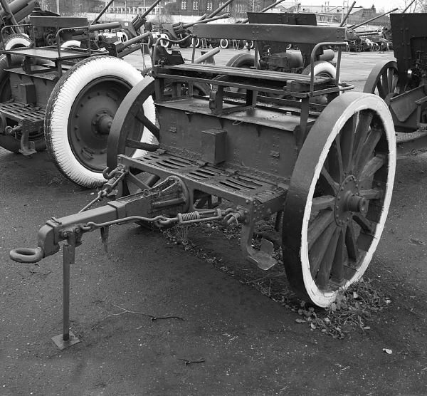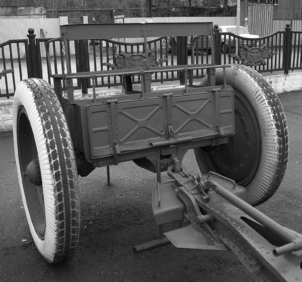 Передок для 122-мм гаубиц обр. 1910/30 и 1909/37 гг. на металлических колёсах с шиной ГК. Орудие шворневой лапой на хоботовой части лафета надето на крюк передка.
