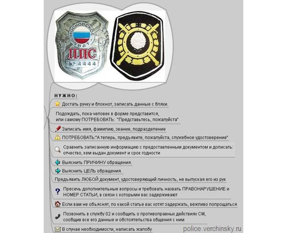 Конечно же, я говорю, как и большинство того, что я рассказываю, о ситуации для общественных мест, где есть свидетели. Если же общение с сотрудниками милиции происходит в тёмном переулке в два часа ночи – там уже не только удостоверение не разглядеть; не знаю даже, что можно порекомендовать в таком случае. Я думаю, в два часа ночи в подворотне сотрудники милиции не несут службу. Правда, может быть, что-то случилось – ограбили какую-нибудь квартиру. Очень много бывает историй, я читал в интернете, когда фальшивые сотрудники милиции, которые просто пользуясь тем, что уже ночь на дворе, никого вокруг нет – они грабят таким образом прохожих, останавливают и грабят.