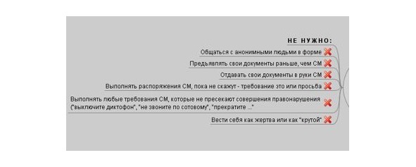И по «02» можно сказать: «Я хочу сделать устное заявление, хочу подать устную жалобу». Если вы сообщите свой адрес, то вам могут выслать ответ на ваш адрес. Можно сделать по-другому: придя домой, написать жалобу и подать её в соответствующие инстанции почтой или через интернет. Подробнее, куда можно пожаловаться на сотрудника милиции, мы рассмотрим в одном из последних кастов. А сейчас ещё рассмотрим важную вторую половину рисунка, которая называется «Что не нужно делать при общении с сотрудниками милиции» (рис. 9).