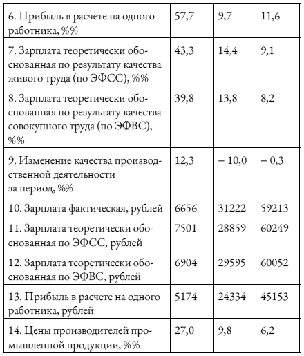 Через системную оценку результатов роста производительности труда видна и значительная выгода от повышения качества труда для бизнеса. В те периоды, когда повышалось качество труда, самыми быстрыми темпами росла прибыль в расчёте на одного работника (пункт 6 таблицы). В первом периоде среди всех показателей системной оценки роста производительности труда самыми быстрыми были темпы роста прибыли в расчёте на одного работника. Аналогичная ситуация наблюдается и в третьем периоде. А во втором периоде, когда качество производственно-коммерческой деятельности снижалось, среди всех системных показателей роста производительности самым малым был рост прибыли. Этот результат роста или снижения качества труда особенно важен для бизнеса.