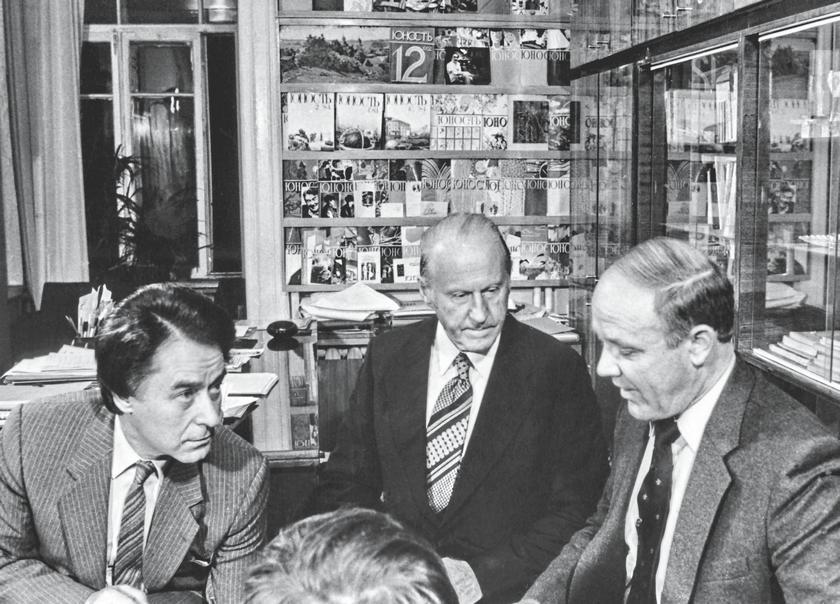 На заседании редколлегии журнала многие предстоящие публикации обсуждались с выдающимися деятелями культуры – Андреем Вознесенским, Майей Плисецкой, Олегом Комовым, главным художником «Юности» Юрием Цишевским (слева)
