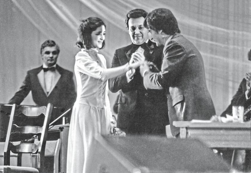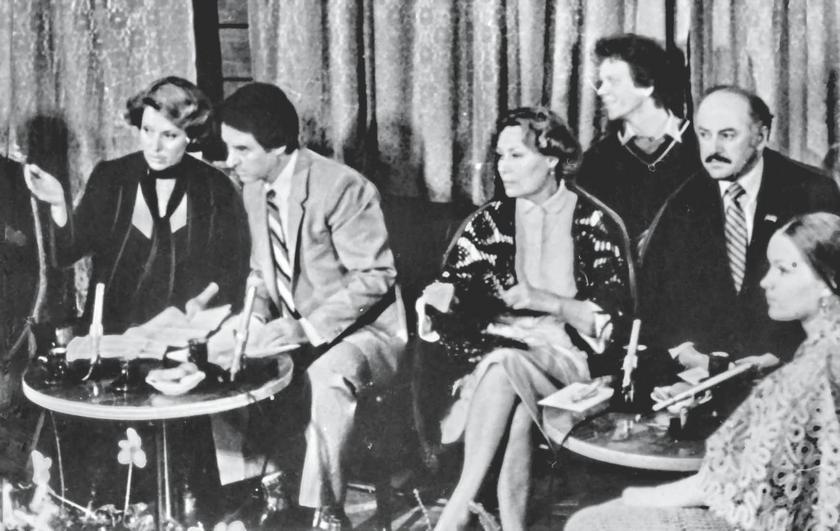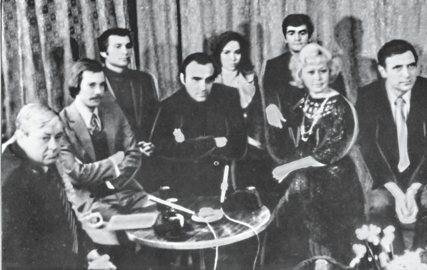 Одна из самых популярных телепрограмм 70-х «Театральные встречи». В силу артистичности Андрея Дементьева пригласили вести программу. Александр Лазарев и Светлана Немоляева (слева в центре), Донатас Банионис (крайний слева), за ним Владимир Конкин