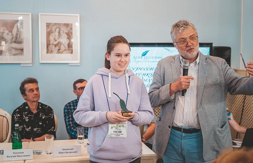 Председатель жюри конкурса молодых поэтов – прославленный писатель Юрий Поляков – вручает памятный приз, бронзовую статуэтку, «Зеленый листок» победительнице Елизавете Евстигнеевой. 2022