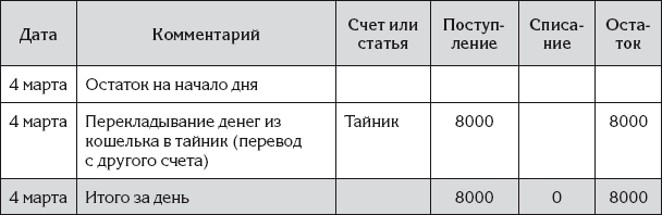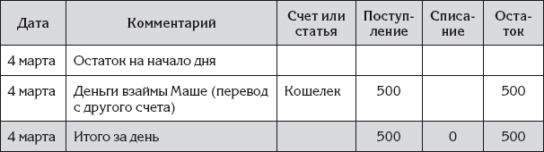 Посмотрим, как будет выглядеть Иринина таблица с записями уже знакомых нам денежных операций по счету Кошелек за 4 марта (табл. 8).