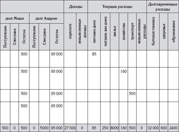 Однако представленная таблица уже с трудом поместилась по ширине Ирининой тетради. Не слишком удобно будет добавлять новые счета: для них нужно будет либо оставлять запасные столбца, либо полностью перерисовывать таблицу.
