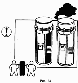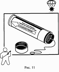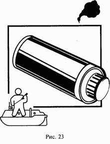 Существуют и другие разновидности дымовых шашек. Вплоть до таких, с которыми одному человеку просто не справиться. Например, большая дымовая сигнальная шашка имеет длину 74 см, диаметр 21 см и вес 32 кг! Горит эта гигантская «дымовуха» 8 мин, а сигнал ее виден за 20 км (рис. 24)!