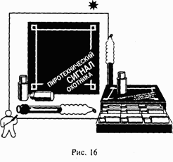 В охотничьих магазинах сейчас можно найти гражданский вариант мортирок, имеющий название «Пиротехнический сигнал охотника». В комплект входит пусковое приспособление и патроны красного, желтого и зеленого огней (рис. 16).