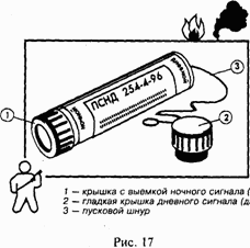 !Сигналом бедствия принято считать одну или несколько ярко-красных или малиновых звездочек, выпускаемых поодиночке через короткие промежутки времени с помощью пистолета-ракетницы, или долгий красный свет планирующей парашютной ракеты (рис. 10).