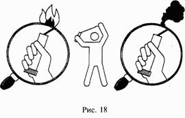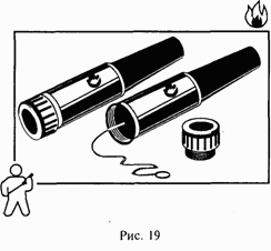 Патроны сигнальные ночного и дневного действия (ПСНД), имеющие цилиндрический корпус длиной 172 мм, диаметром 35 мм и весом 190 г (рис. 17), пользуются заслуженным признанием у путешественников. Принцип действия у них тот же, что и у ракет. Патрон приводится в действие выдергиванием запального шнура. Только необходимо помнить: расположение пускового шнура в сигнальном патроне противоположно ракете! То есть сигнал срабатывает в ту же сторону, куда дергается шнур! Если об этом забыть и выдернуть шнур не от себя, а по ракетной привычке – к себе, можно сильно опалить лицо (рис. 18)!