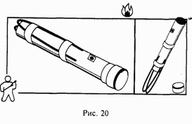 Упомяну о факел-свече, применяемой в железнодорожном транспорте для подачи аварийного сигнала приближающемуся к месту аварии составу. Вернее, когда-то применяемой, а сейчас повсеместно вытесняемой более современными радиотехническими средствами аварийной связи. Факел-свеча – это тот же фальшфейер, для удобства имеющий две выдвижные проволочные ручки. Они позволяют удерживать руку на безопасном расстоянии от открытого пламени и способствуют полному сгоранию фальшфейера (рис. 20).