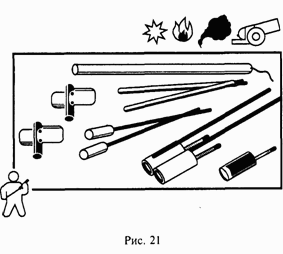 Несколько слов следует сказать о появившихся в массовой продаже и не поддающихся поименному перечислению различных китайских и им подобных фейерверков (рис. 21). Как сигнальные средства, все эти ракеты, петарды, «жуки», «бабочки», «самолеты», огни, бенгальские свечи и тому подобные хлопушки не очень надежны. В первую очередь тем, что некачественно исполнены и не предназначены для эксплуатации в сложных метеорологических условиях. Отсюда частые осечки, неполное сгорание световых зарядов, невозможность просчитать траекторию полета сигнальной звездочки.