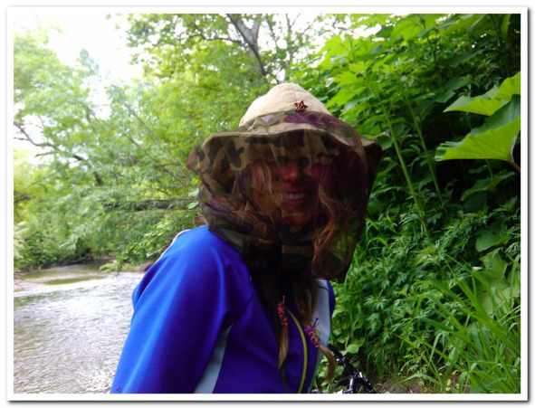 Лишь море скрылось за ближайшими деревьями оживился комариный клан, и чем глубже, тем настойчивей звучал до крови знакомый писк. У Инги начало пухнуть лицо от укусов, пришлось отдать ей свой накомарник. При переходе речки я даже снимать обувь не стал, я уже видел, что это бесполезные телодвижения, скоро все будет… ну в общем вам по пояс будет. Тем не менее после речки пошли приличные такие кусочки, где мы ехали на велосипеде. Выглянуло солнце, мы повеселели вконец, к тому же собака со стана, что увязалась с нами, демонстрировала полную решимость проводить нас как можно дальше, а глядя на многочисленные, порой колоссально огромные следы медведей – это ну очень сильно вдохновляло, а собачка еще и охотничьи навыки демонстрировала, одиночно лая, когда загоняла очередную белку (соболя) на дерево.