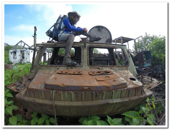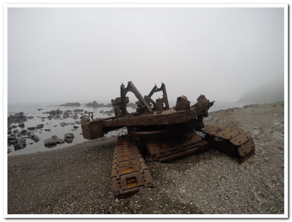 Мы застыли в страхе и робости, уж не знаю что было бы, куда б бежали, если б не дуновение ветра обнажившего истину чудовища. Древняя гусеничная машина, как будто выползла на последнем издыхании из глубин моря пугать одиноких путников, таких как мы. Шутка, конечно, эта груда железа нас и не испугала совсем, некоторую тревогу вызывали совсем другие обстоятельства… медвежьи. Началось все со звуков. Известно, что медведи настоящие асы во всех аспектах таежной жизни. Вот и ходят они так, что не услышишь ни звука, но только тогда, когда это им нужно, в раслабоне медведь трещит всем подряд не хуже нас с вами. И вот такой расслабляющийся медведь решил идти с нами в унисон по берегу моря. Только он по кромке террасы, а мы по пляжику (но видеть мы его не видели). Треск бамбука до небес сопровождал нас некоторое время, но вскоре, по всей видимости, медведю эта игра надоела и он куда-то то свернул в чащобу. И вновь в наш мир ворвался лишь гул прибоя и крики чаек!