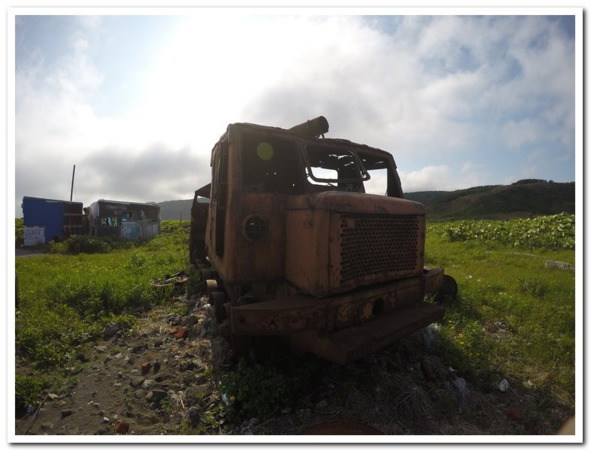 План был прост. Встать тогда, когда хотелось и выйти к мысу Конабеева, чтобы попробовать его пройти по старой японской конской дорожке вырубленной в скале. Тем более вчера Сергей говорил, что по слухам этот вариант возможен. Но все пошло не так, к нам подошел парень из стана рыбаков и сказал, что у них не получилось пройти через мыс на ту сторону, море разрушило то, что японцы вытесали в скале в 20-е годы 20-го века. Пришлось задуматься. Идти 2 км до Конабеева, потом обнаружить что он не проходится, значит по ручью залезать через бамбук на сопочку, через которую и можно обрулить данный мыс. Это легко без велосипедов, даже мозг напрягать не стоит, но наши верные «кони», с ними это будет через большой пот и напряжение в мышечных волокнах. Возможно ли будет все это? Мы не собирались устраивать подвиги ценой в травмы и разочарования. А есть ли другой путь? Да, имеется. В обход всего этого каменистого нагромождения идет древняя японская дорога, ныне заброшенная, но периодически вспахиваемая квадроциклистами и отдельными командами джипов. Порядка 13 км, уходя сначала далеко вглубь полуострова, она по длинной дуге обходит Конабеева и оказывается сразу в Атласово, на мысе Анастасии. И мы выбираем длинный путь.